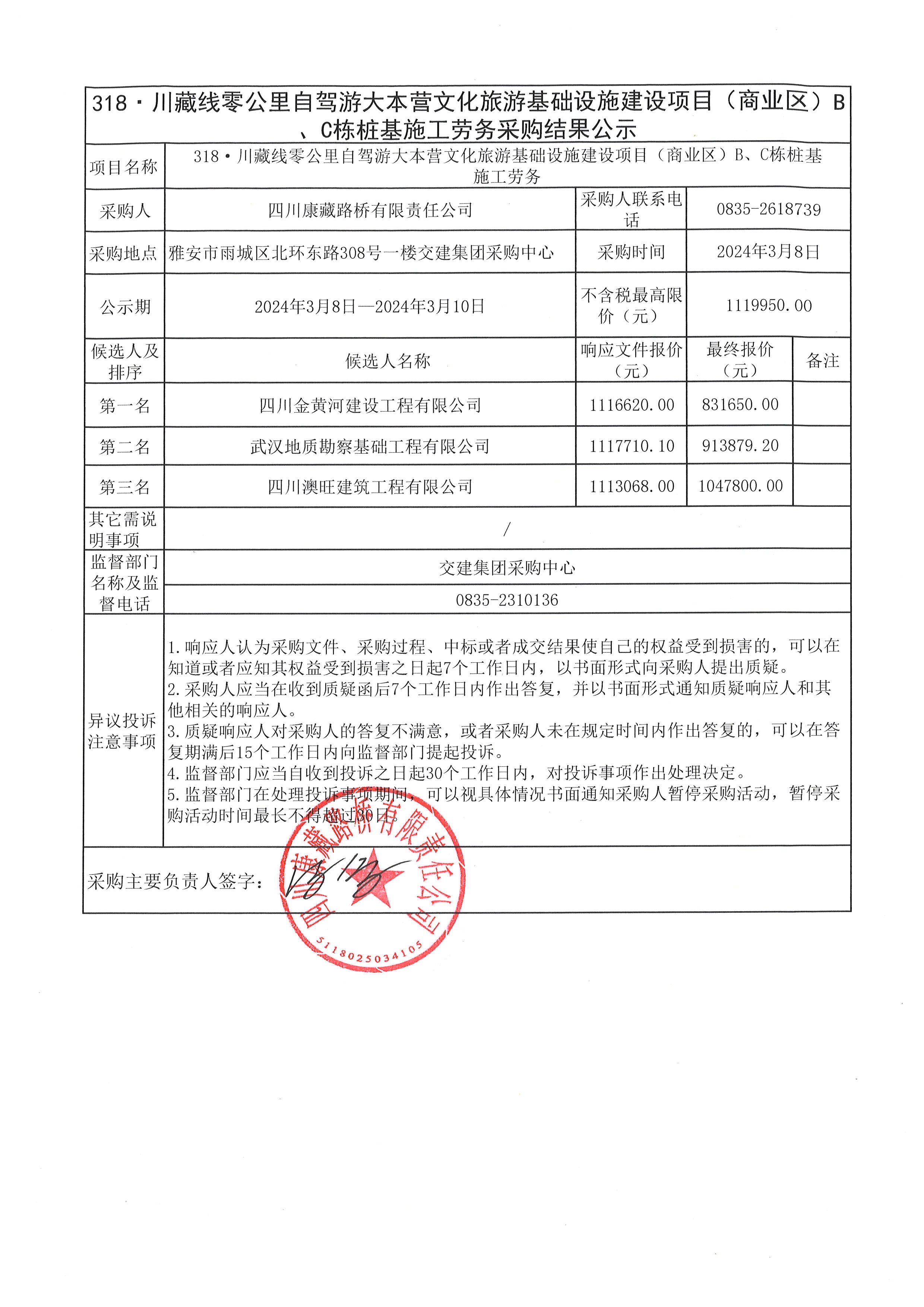四川康藏路橋有限責(zé)任公司318·川藏線零公里自駕游大本營文化旅游基礎(chǔ)設(shè)施建設(shè)項(xiàng)目(商業(yè)區(qū))B、C棟樁基施工勞務(wù)結(jié)果公示