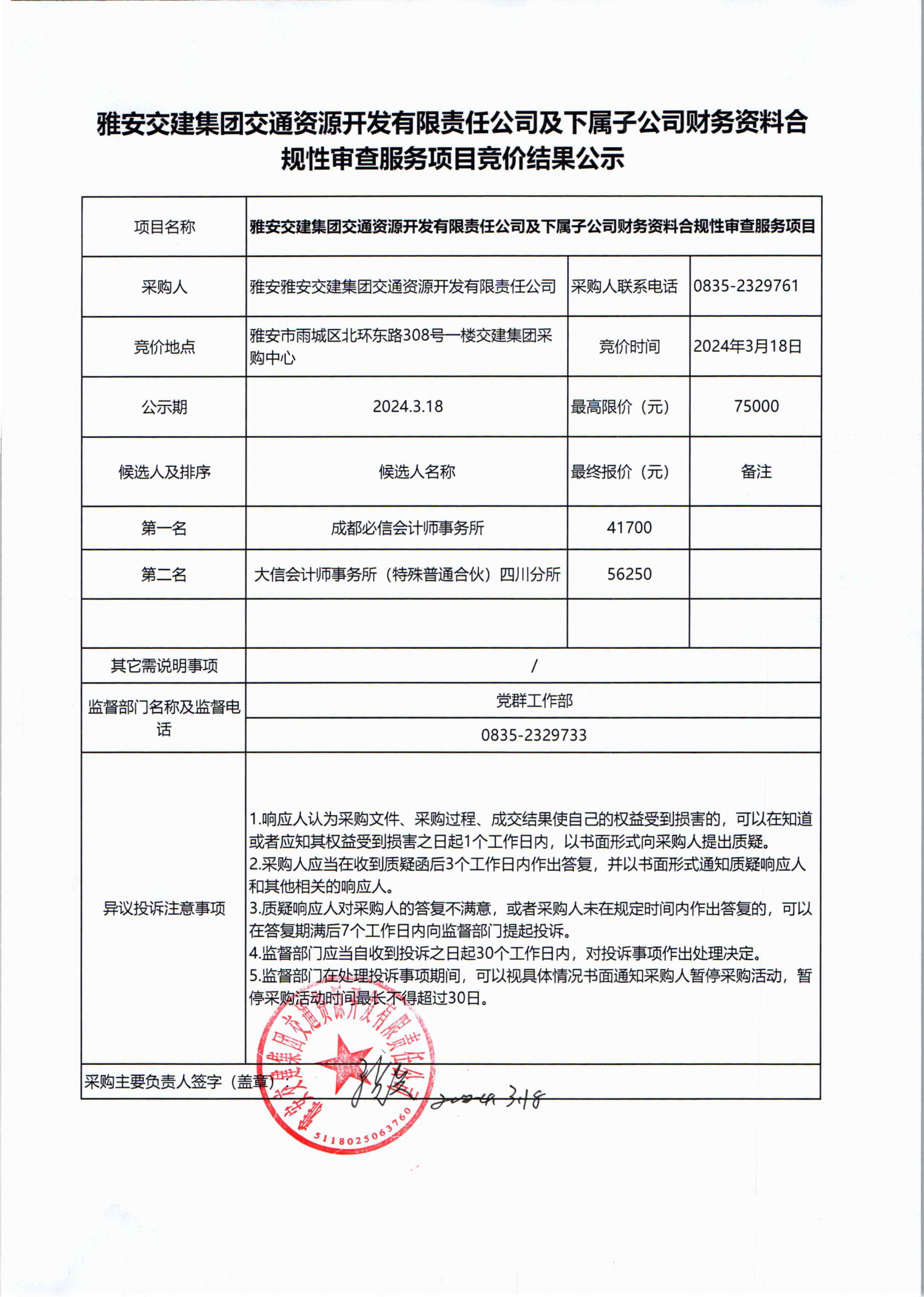 雅安交建集團交通資源開發(fā)有限責任公司及下屬子公司財務資料合規(guī)性審查服務項目競價結(jié)果公示