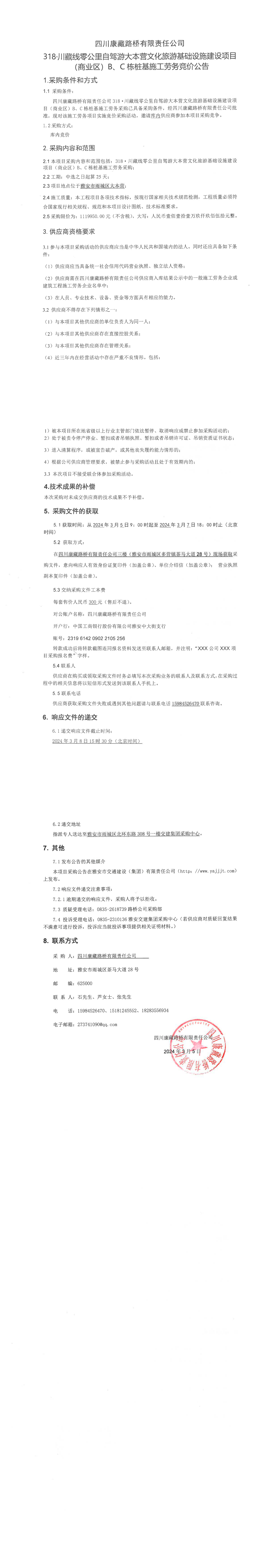 四川康藏路橋有限責任公司318·川藏公路零公里自駕游大本營文化旅游基礎(chǔ)設(shè)施建設(shè)項目(商業(yè)區(qū))B\C棟樁基施工勞務競價公告