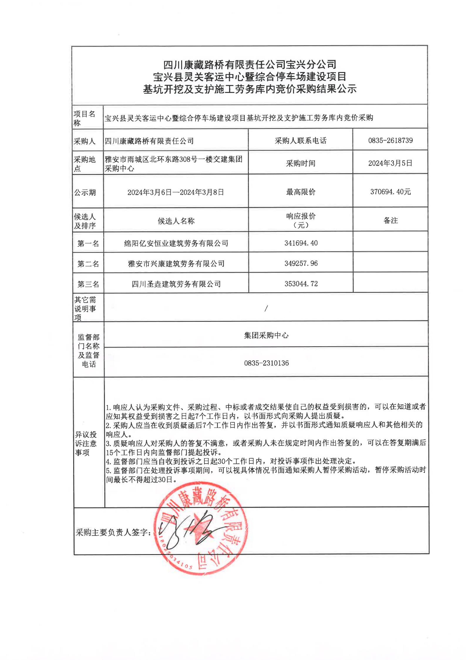 四川康藏路橋有限責任公司寶興分公司寶興縣靈關客運中心暨綜合停車場建設項目基坑開挖及支護施工勞務庫內(nèi)競價采購結果公示