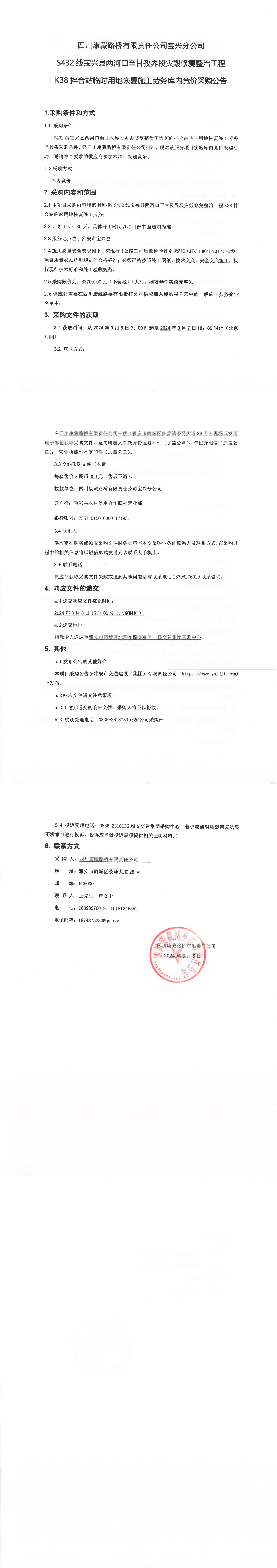 四川康藏路橋有限責(zé)任公司S432線寶興縣兩河口至甘孜界段災(zāi)毀修復(fù)整治工程K38拌合站臨時(shí)用地恢復(fù)施工勞務(wù)庫(kù)內(nèi)競(jìng)價(jià)采購(gòu)公告