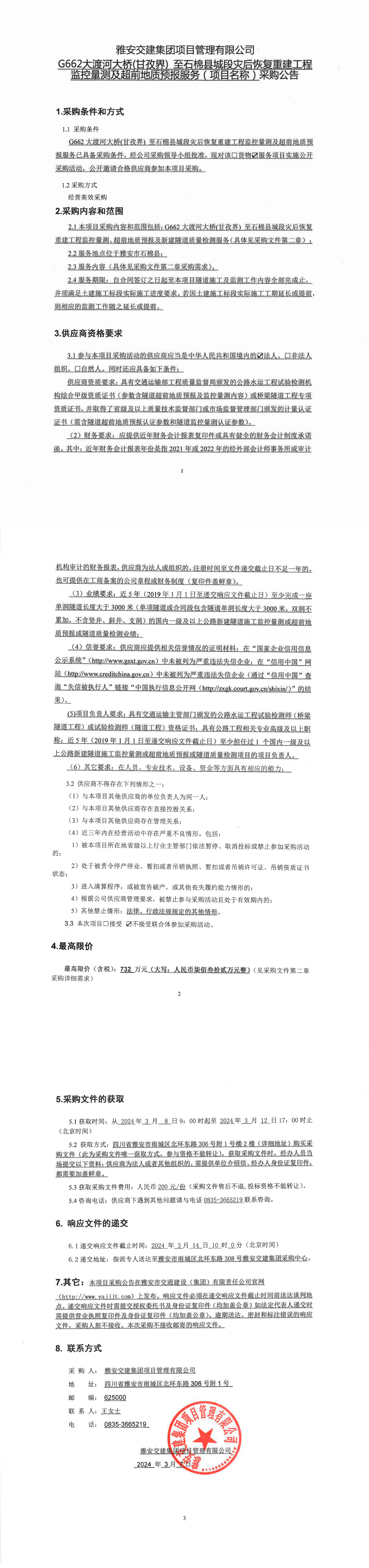 雅安交建集團項目管理有限公司G662大渡河大橋(甘孜界)至石棉縣城段災后恢復重建工程監(jiān)控量測及超前地質預報服務(項目名稱)采購公告