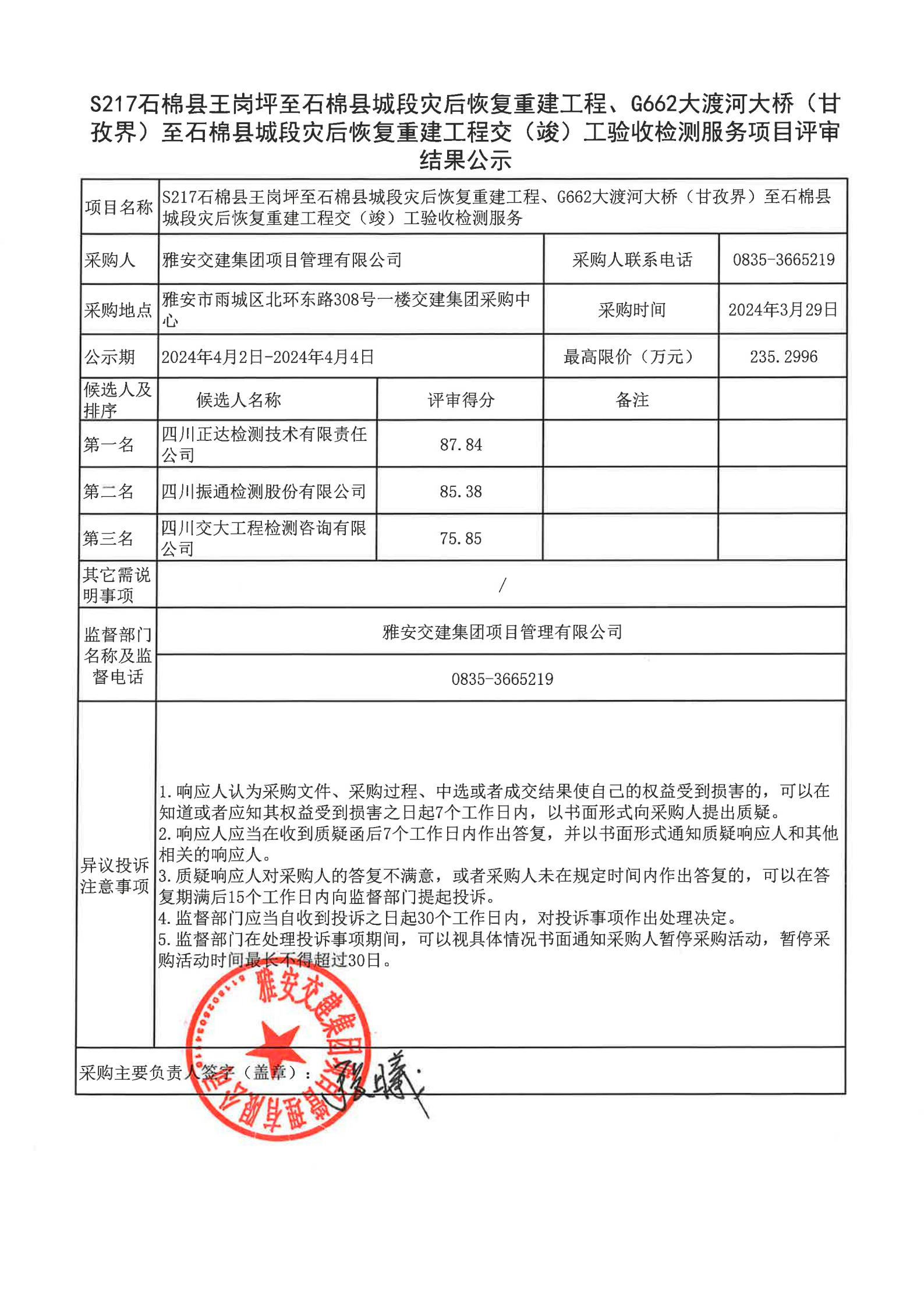 雅安交建集團(tuán)項(xiàng)目管理有限公司S217石棉縣王崗坪至石棉縣城段災(zāi)后恢復(fù)重建工程、G662大渡河大橋(甘孜界)至石棉縣城段災(zāi)后恢復(fù)重建工程交(竣)工驗(yàn)收檢測(cè)服務(wù)項(xiàng)目評(píng)審結(jié)果公示