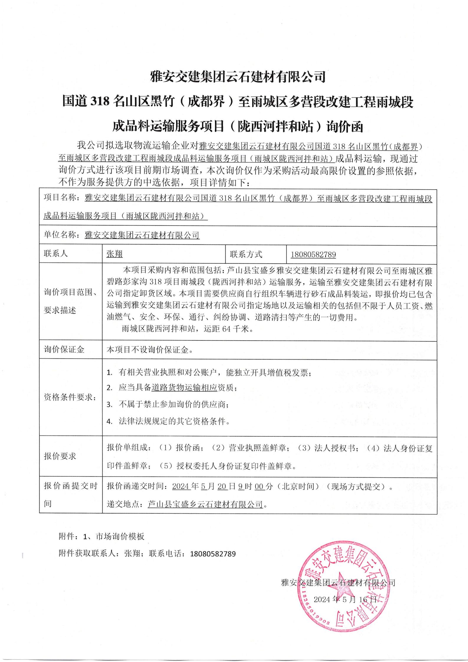 雅安交建集團(tuán)云石建材有限公司國道318名山區(qū)黑竹(成都界)至雨城區(qū)多營段改建工程名山段成品料運輸服務(wù)項目(皇茶大道拌和站)詢價函