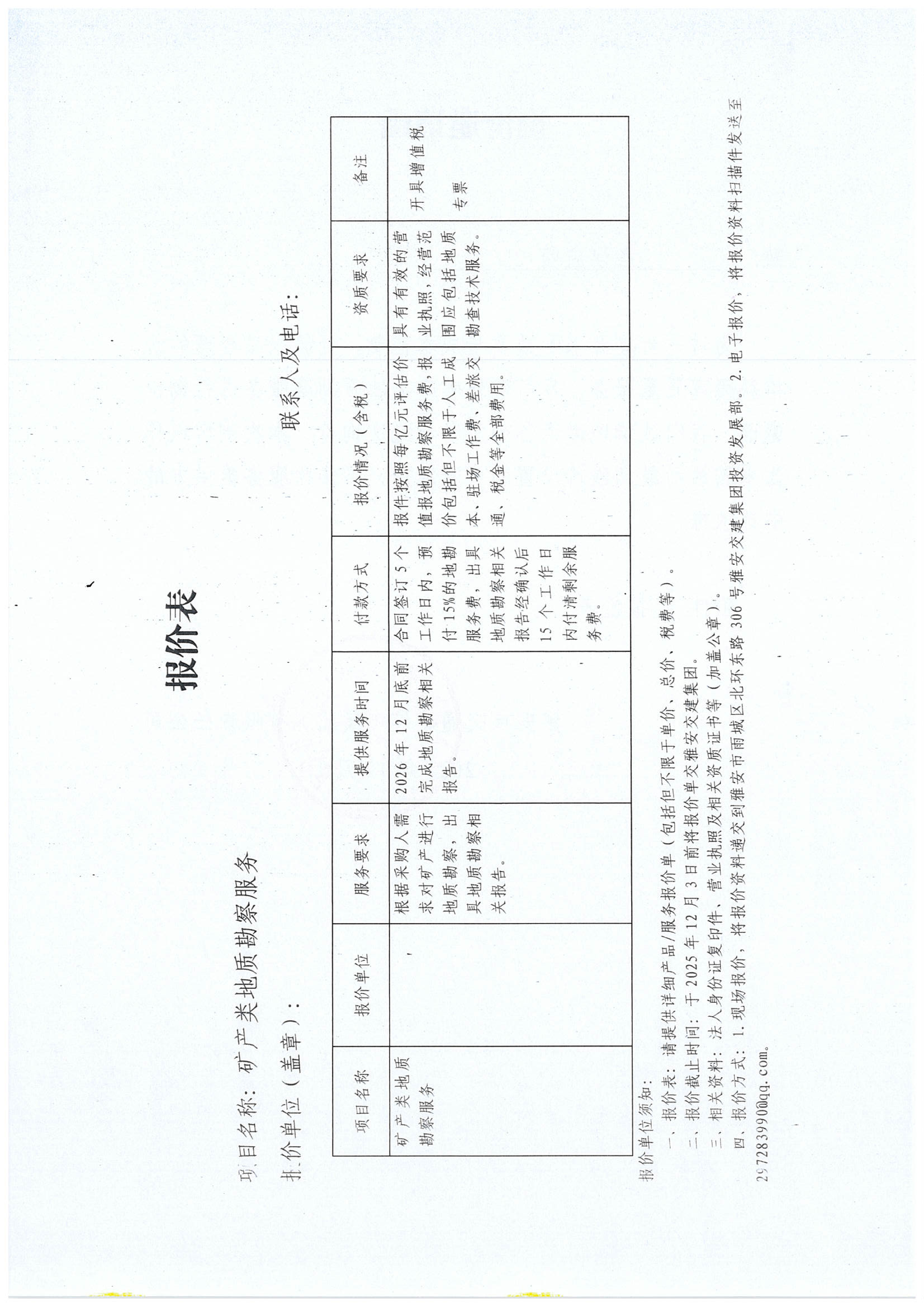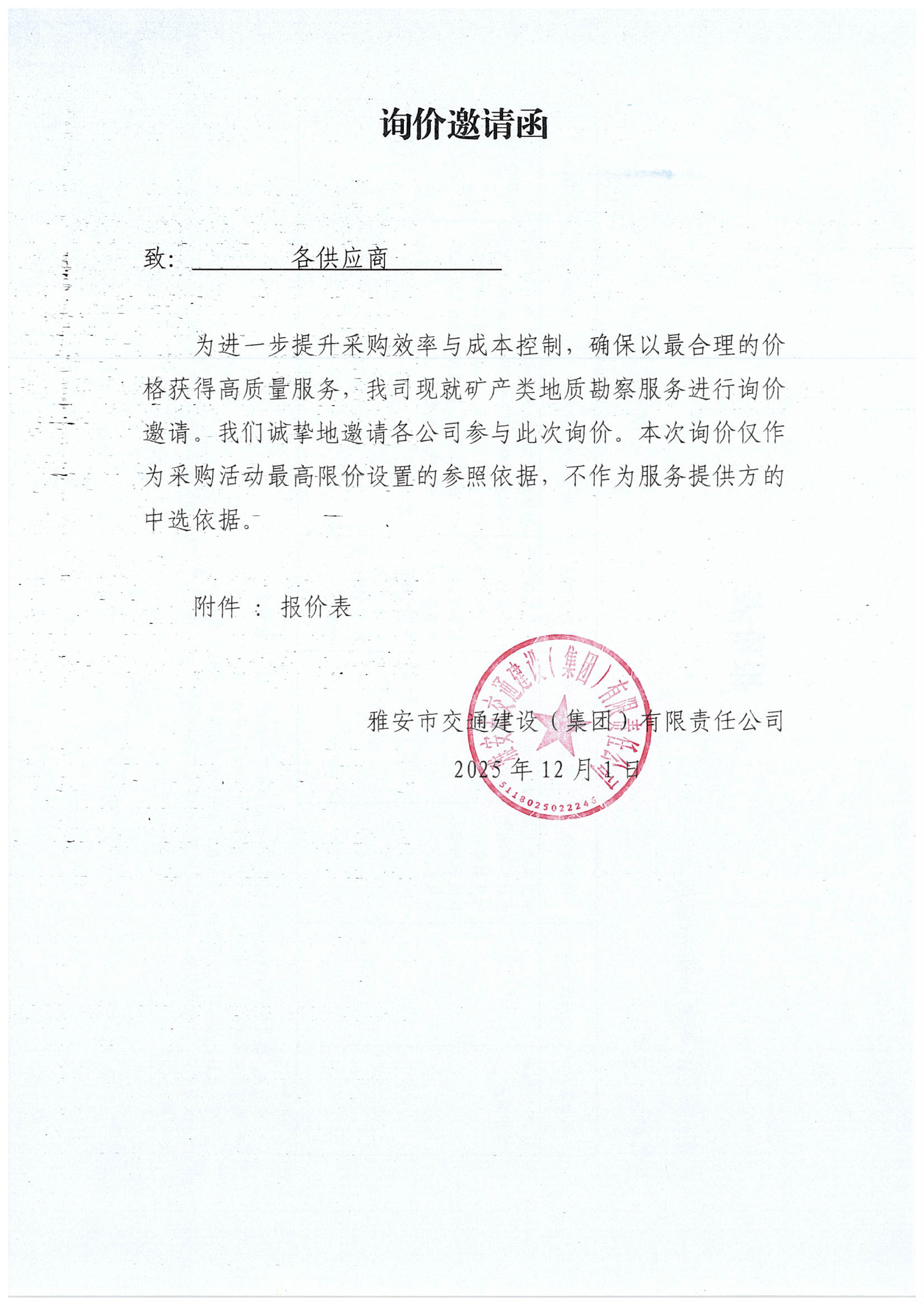 關于雅安市交通建設(集團)有限責任公司礦產(chǎn)類地質勘察服務限價的詢價函