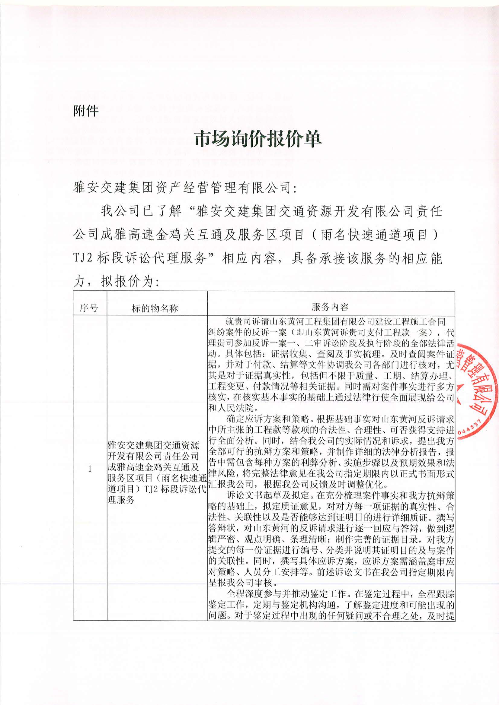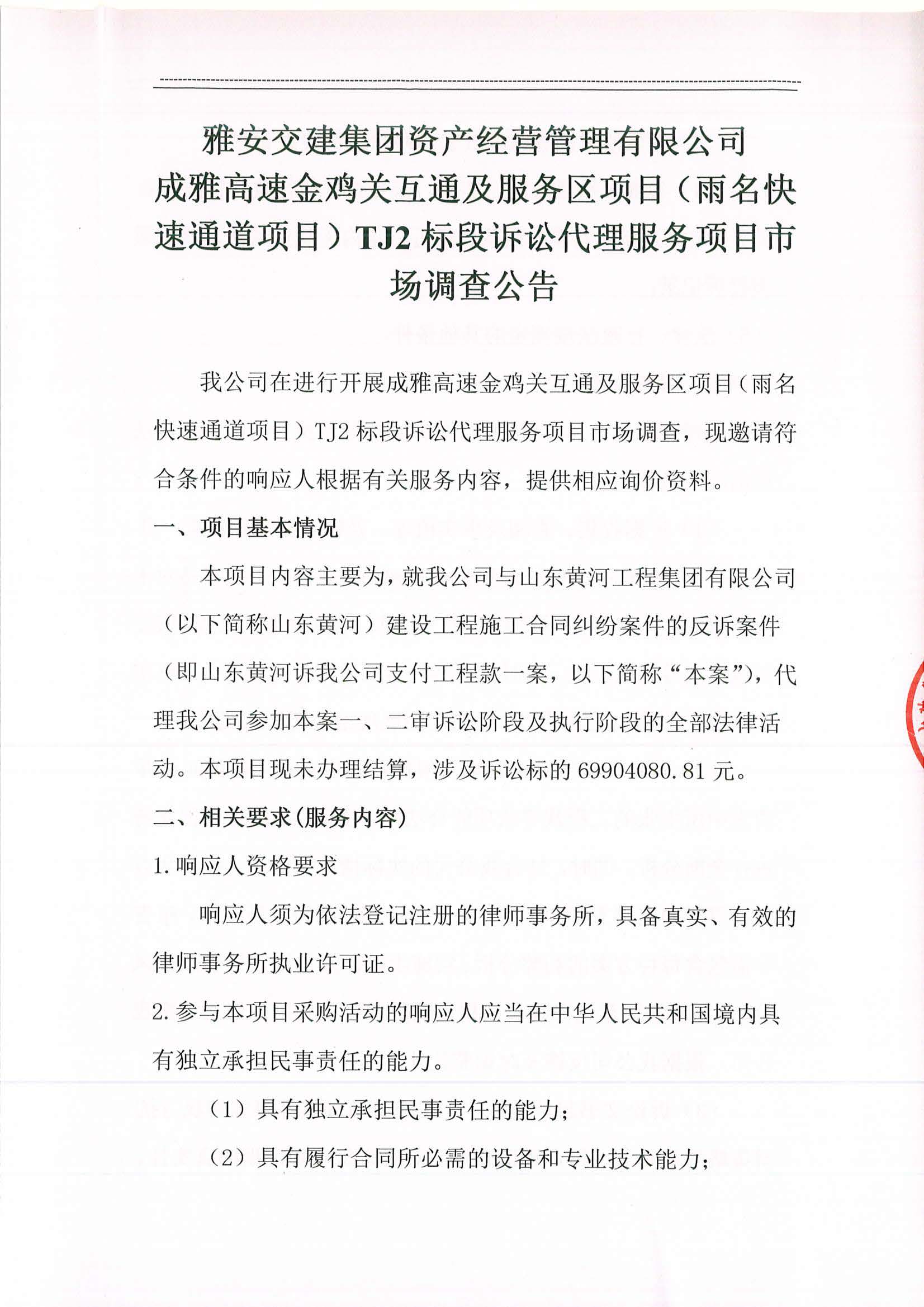 雅安交建集團(tuán)資產(chǎn)經(jīng)營管理有限公司成雅高速金雞關(guān)互通及服務(wù)區(qū)項目(雨名快速通道項目)TJ2標(biāo)段訴訟代理服務(wù)項目市場調(diào)查公告