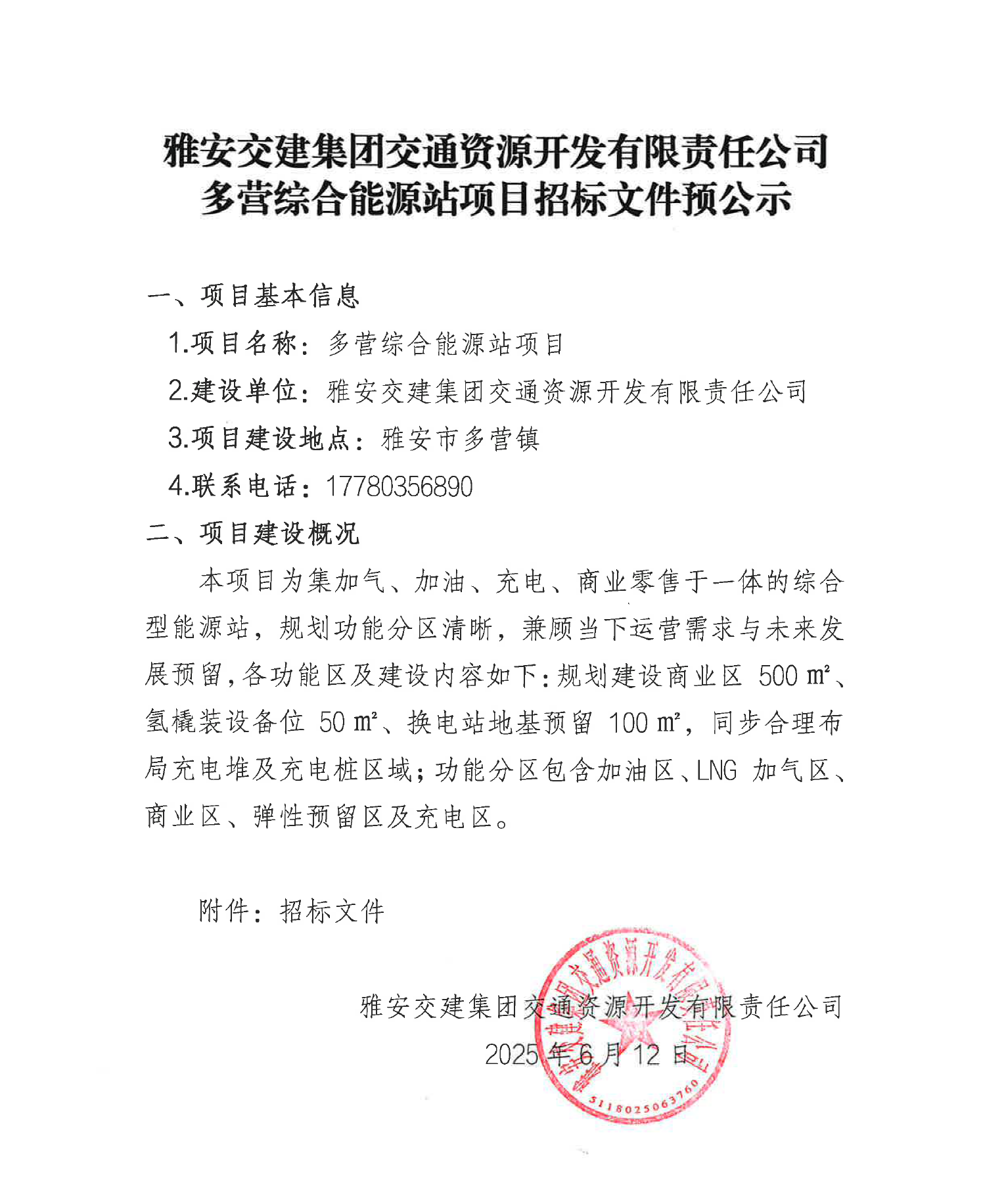 雅安交建集團交通資源開發(fā)有限責任公司多營綜合能源站項目招標文件預公示