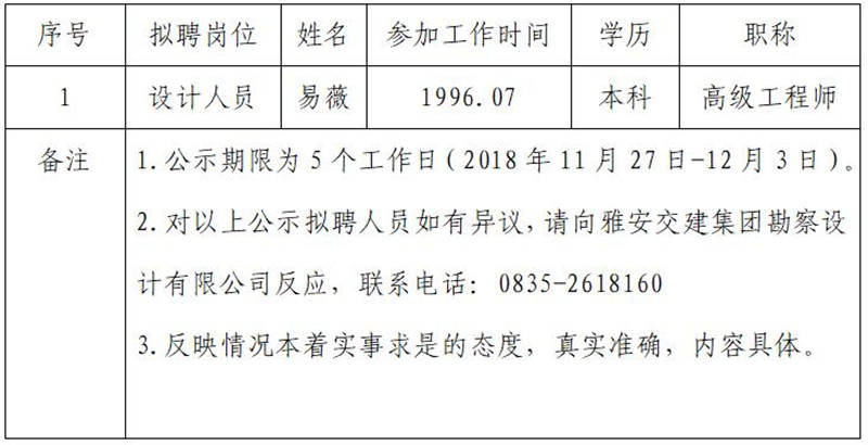 雅安交建集團勘察設計有限公司擬聘用人員公示