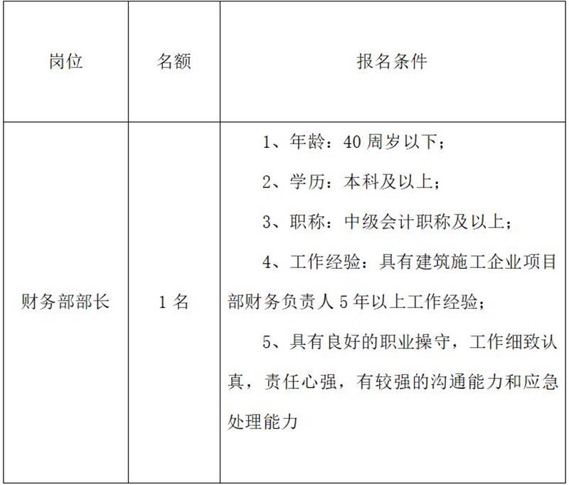 雅安交建集團路橋有限責任公司是雅安市交通建設(集團)有限責任公司下屬子公司,主要從事道路、橋梁修建,F(xiàn)根據(jù)公司業(yè)務發(fā)展需要,擬向社會公開招聘1名財務部部長,現(xiàn)將有關事項公告如下:
