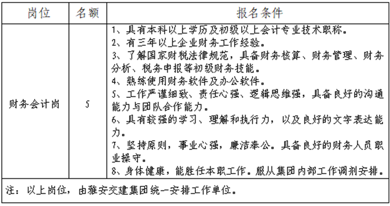 根據(jù)發(fā)展需要,決定面向社會(huì)公開(kāi)招聘雅安市交通建設(shè)(集團(tuán))有限責(zé)任公司(以下簡(jiǎn)稱(chēng)“雅安交建集團(tuán)”)所屬子公司財(cái)務(wù)工作人員5名,現(xiàn)將有關(guān)事項(xiàng)公告如下: