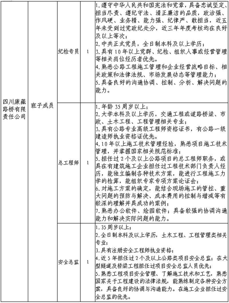 根據(jù)發(fā)展需要,決定面向社會(huì)公開招聘雅安市交通建設(shè)(集團(tuán))有限責(zé)任公司(以下簡(jiǎn)稱“雅安交建集團(tuán)”)所屬子公司班子成員4名,現(xiàn)將有關(guān)事項(xiàng)公告如下: