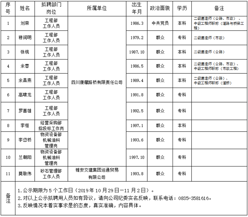 雅安交建集團(tuán)所屬子公司擬聘用人員公示