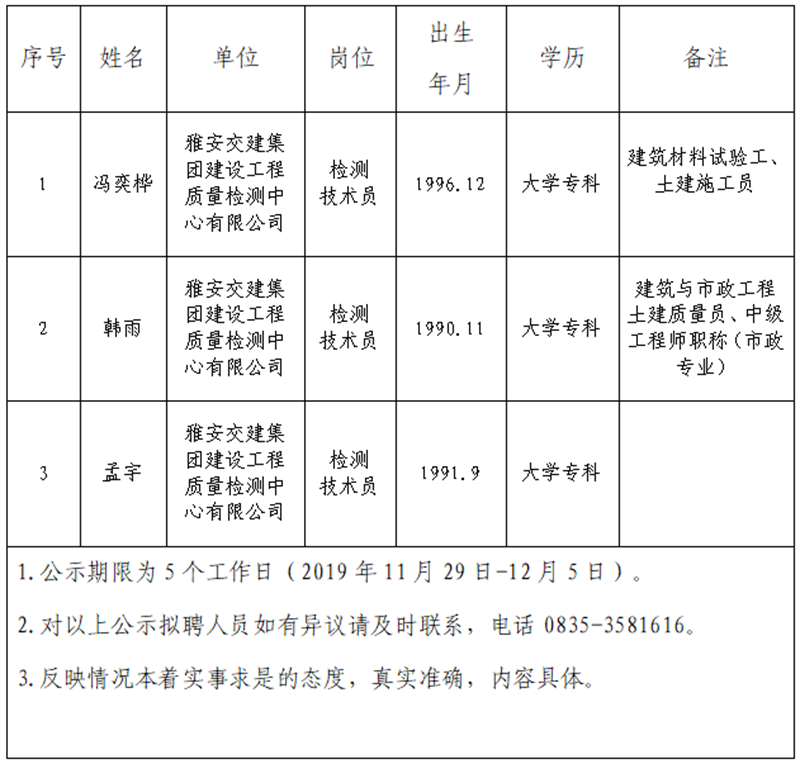 雅安交建集團(tuán)子公司擬聘用人員公示(檢測中心)