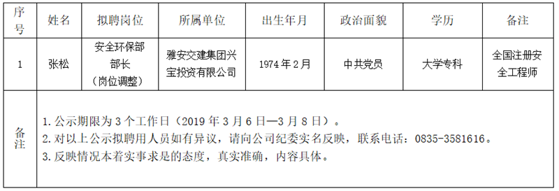 雅安交建集團(tuán)子公司擬聘用人員公示(興寶公司)