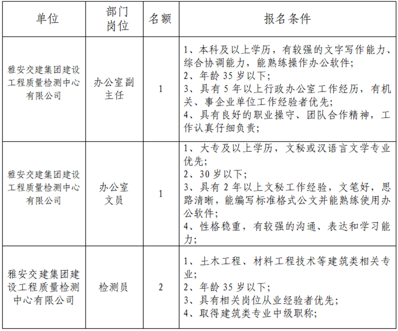 根據發(fā)展需要,決定面向社會公開招聘雅安市交通建設(集團)有限責任公司(以下簡稱“雅安交建集團”)所屬子公司工作人員4名,現將有關事項公告如下: