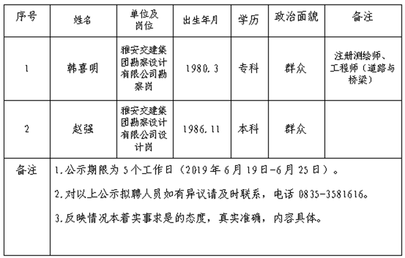 雅安交建集團子公司擬聘用人員公示 (勘察設(shè)計公司)