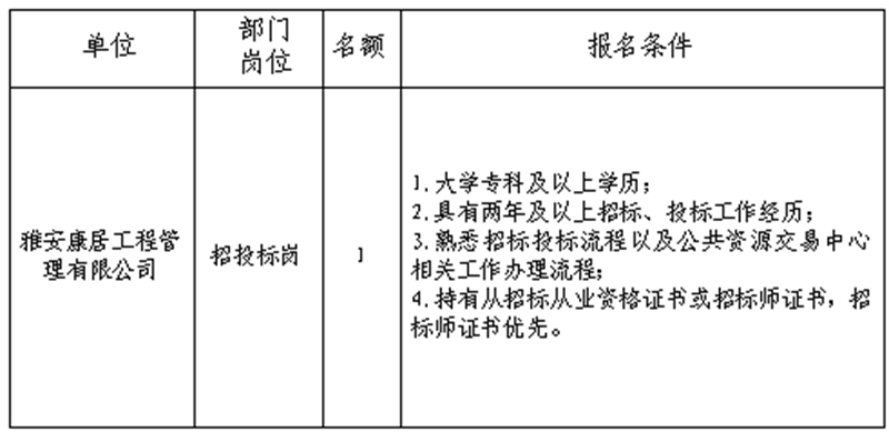 根據發(fā)展需要,決定面向社會公開招聘雅安市交通建設(集團)有限責任公司(以下簡稱“雅安交建集團”)所屬子公司工作人員1名,現將有關事項公告如下: