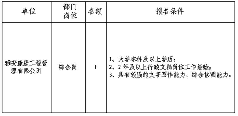 根據(jù)發(fā)展需要,決定面向社會公開招聘雅安市交通建設(shè)(集團(tuán))有限責(zé)任公司(以下簡稱“雅安交建集團(tuán)”)所屬子公司工作人員1名,現(xiàn)將有關(guān)事項公告如下: