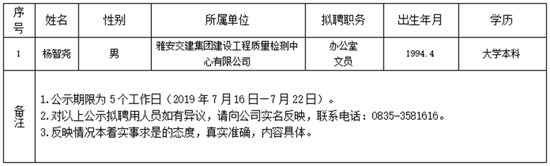 雅安交建集團(tuán)子公司擬聘用人員公示(工程質(zhì)量檢測中心)
