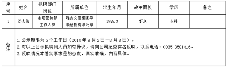 雅安交建集團子公司擬聘用人員公示(平順公司)