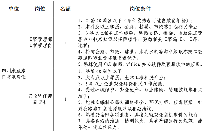 根據(jù)發(fā)展需要,決定面向社會(huì)公開(kāi)招聘雅安市交通建設(shè)(集團(tuán))有限責(zé)任公司(以下簡(jiǎn)稱(chēng)“雅安交建集團(tuán)”)所屬子公司相關(guān)人員3名,現(xiàn)將有關(guān)事項(xiàng)公告如下: