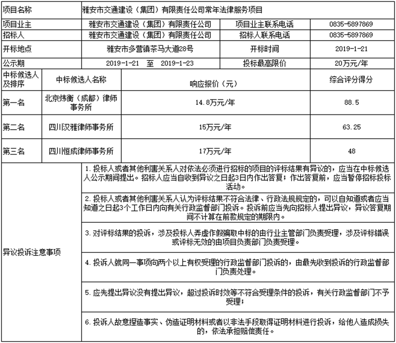雅安市交通建設(shè)(集團)有限責(zé)任公司常年法律服務(wù)項目公示