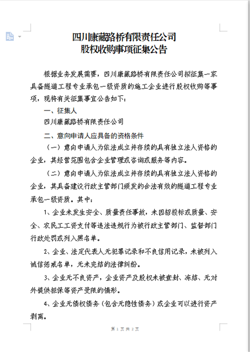 四川康藏路橋有限責(zé)任公司 股權(quán)收購事項征集公告