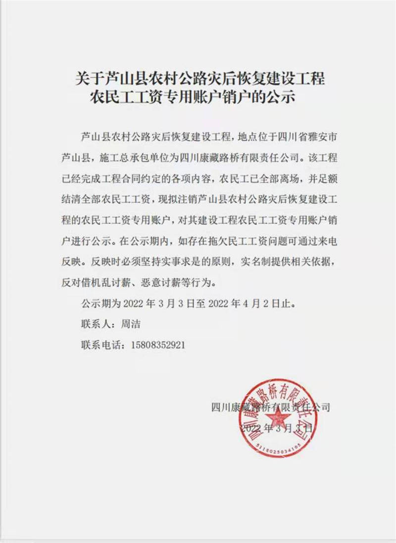 關于蘆山縣農(nóng)村公路災后恢復建設工程 農(nóng)民工工資專用賬戶銷戶的公示