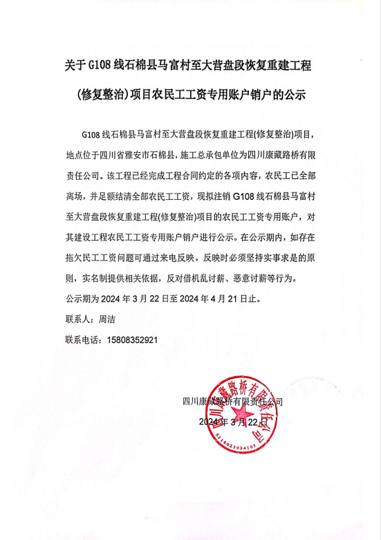 關于G108線石棉縣馬富村至大營盤段恢復重建工程(修復整治)項目農(nóng)民工工資專用賬戶銷戶的公示