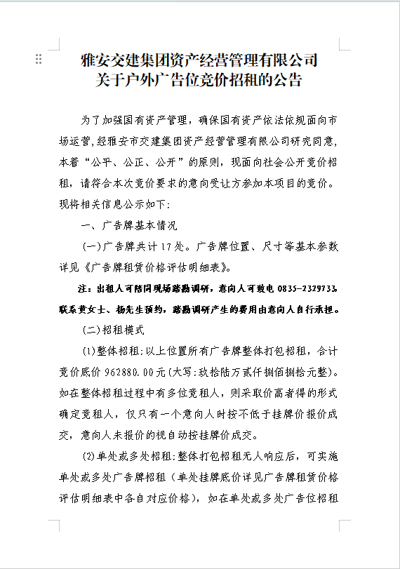 雅安交建集團資產(chǎn)經(jīng)營管理有限公司關于戶外廣告位競價招租的公告
