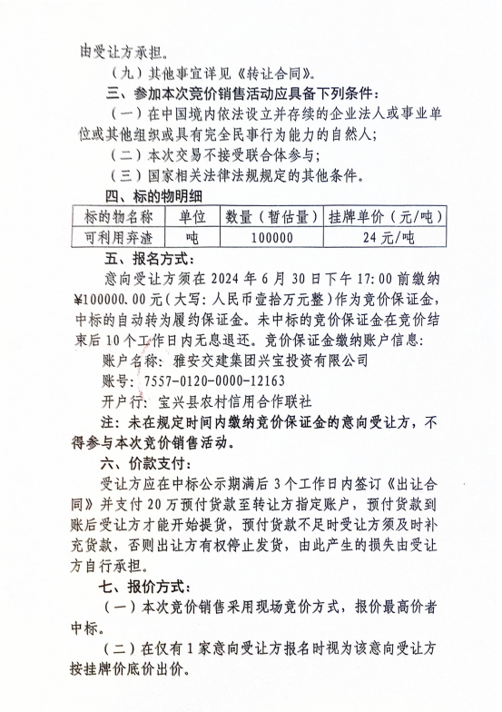 雅安交建集團(tuán)興寶投資有限公司寶興縣靈關(guān)鎮(zhèn)代碑寺土地整理項(xiàng)目10萬(wàn)噸可利用棄渣競(jìng)價(jià)銷售公告(2024.6.21)
