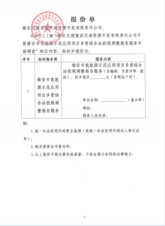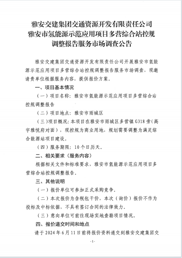 雅安交建集團(tuán)交通資源開發(fā)有限責(zé)任公司雅安市氫能源示范應(yīng)用項(xiàng)目多營(yíng)綜合站控規(guī)調(diào)整報(bào)告服務(wù)市場(chǎng)調(diào)查公告