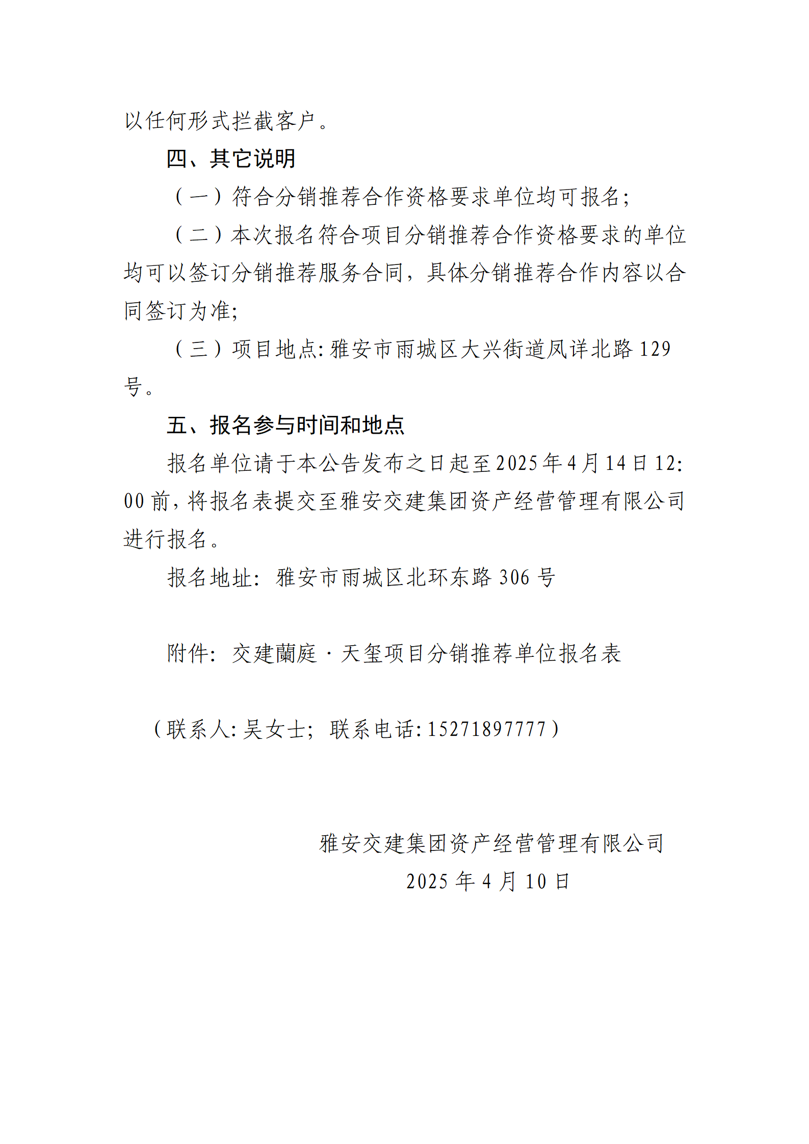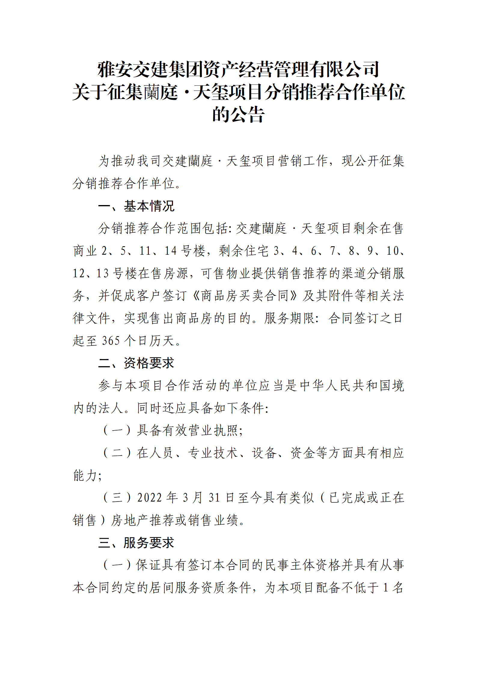 雅安交建集團資產經營管理有限公司 關于征集蘭庭·天璽項目分銷推薦合作單位的公告