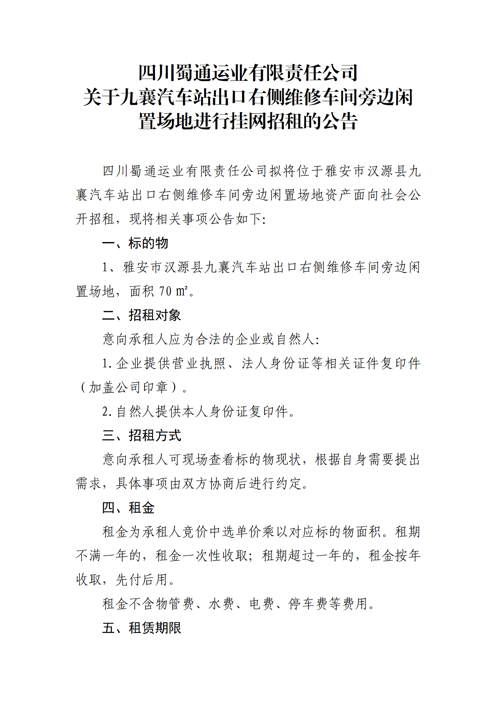 四川蜀通運業(yè)有限責任公司 關于九襄汽車站出口右側(cè)維修車間旁邊閑置場地進行掛網(wǎng)招租的公告