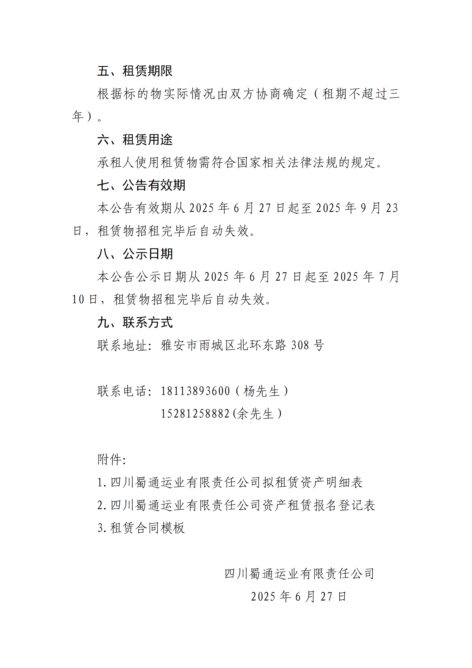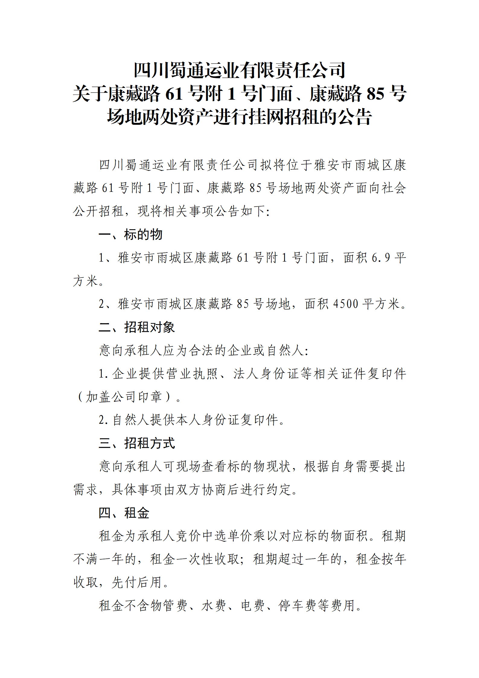 四川蜀通運(yùn)業(yè)有限責(zé)任公司 關(guān)于康藏路61號附1號門面、康藏路85號場地兩處資產(chǎn)進(jìn)行掛網(wǎng)招租的公告