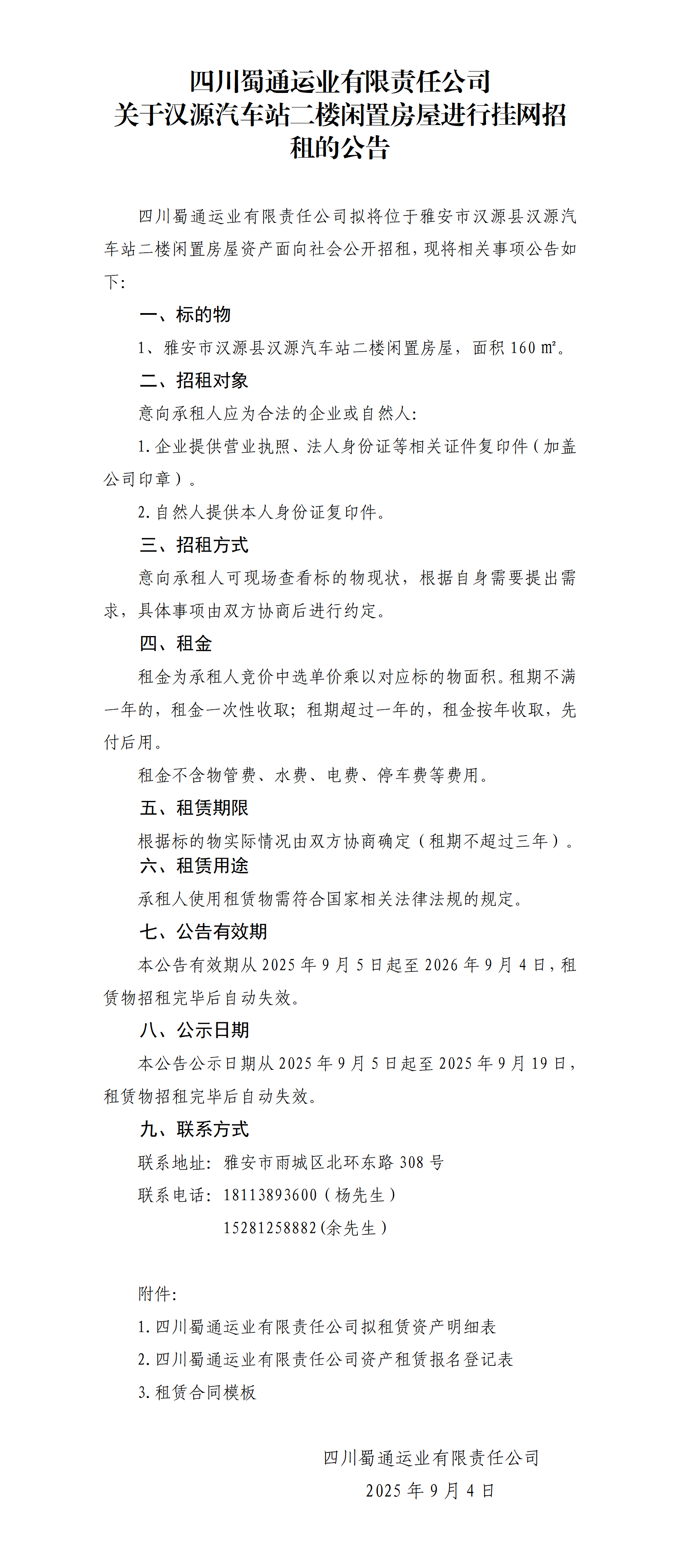 四川蜀通運業(yè)有限責(zé)任公司 關(guān)于漢源汽車站二樓閑置房屋進行掛網(wǎng)招租的公告
