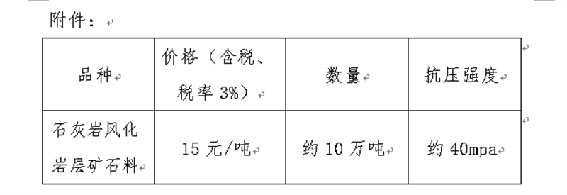現(xiàn)將我公司礦山首采平臺的石灰?guī)r風(fēng)化巖層礦石料定價出售事宜進行公示(見附件),經(jīng)公司研究決定,定價出售風(fēng)化巖層礦石料約10萬噸,現(xiàn)通過集團公司官網(wǎng)信息公示后對外銷售。報名客戶數(shù)不限,銷售方式為先款后貨,簽約銷售,銷售時間以礦山開采和生產(chǎn)計劃為準。