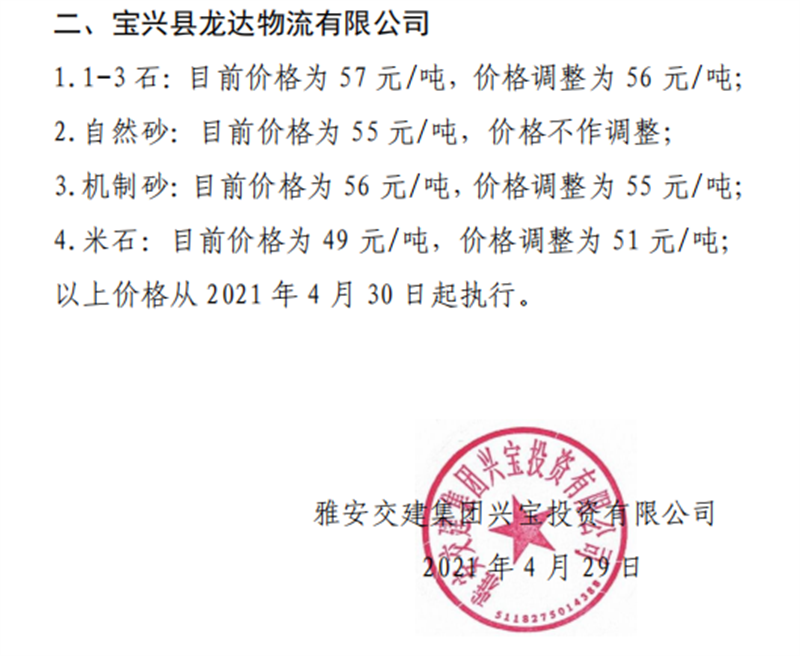 雅安交建集團興寶公司砂石骨料銷售價格情況表(2021.4.30)