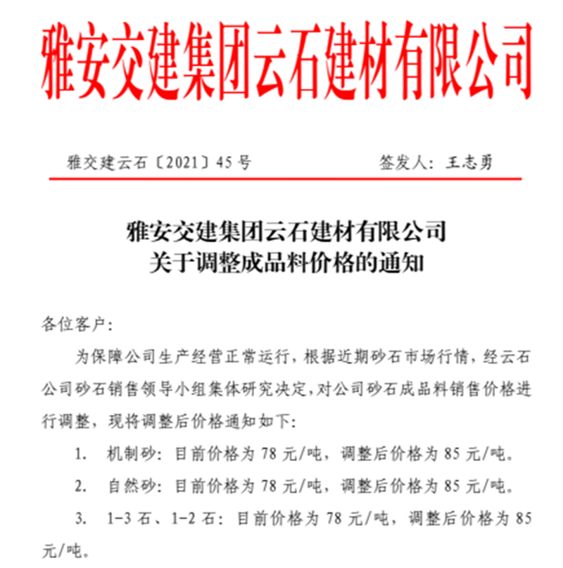 雅安交建集團云石公司關于調(diào)整成品料銷售價格的通知(2021.11.4)