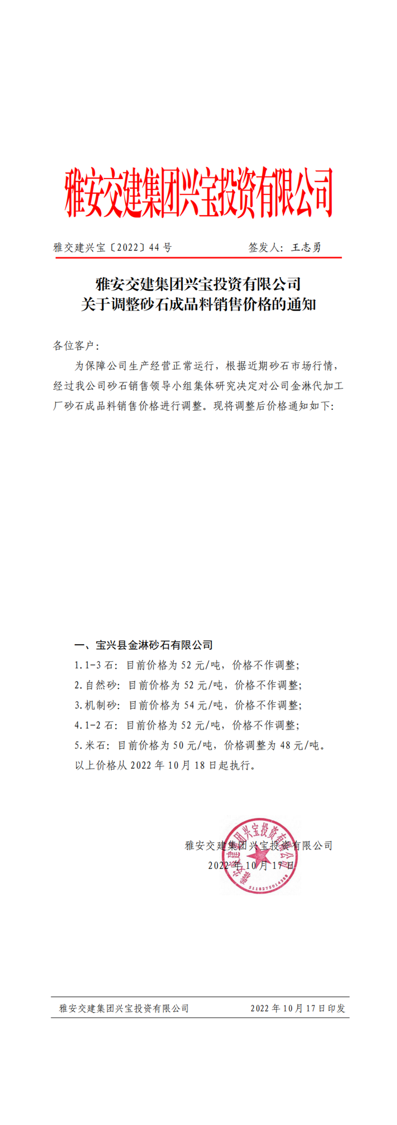 雅交建興寶〔2022〕44號(hào) 關(guān)于調(diào)整砂石成品料銷(xiāo)售價(jià)格的通知10.17