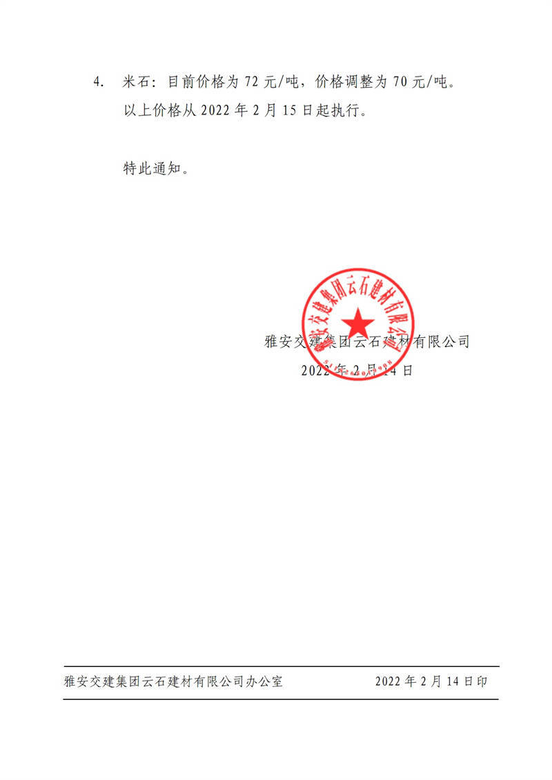 ÑŰ²½»½¨¼¯ˆF(tu¨¢n)ÅdŒšÍ¶ÙYÓÐÏÞ¹«Ë¾ êP(gu¨¡n)ÓÚÕ{(di¨¤o)Õûɰʯ³ÉÆ·ÁÏäNÊÛƒr(ji¨¤)¸ñµÄ֪ͨ£¨2022-2-23£©