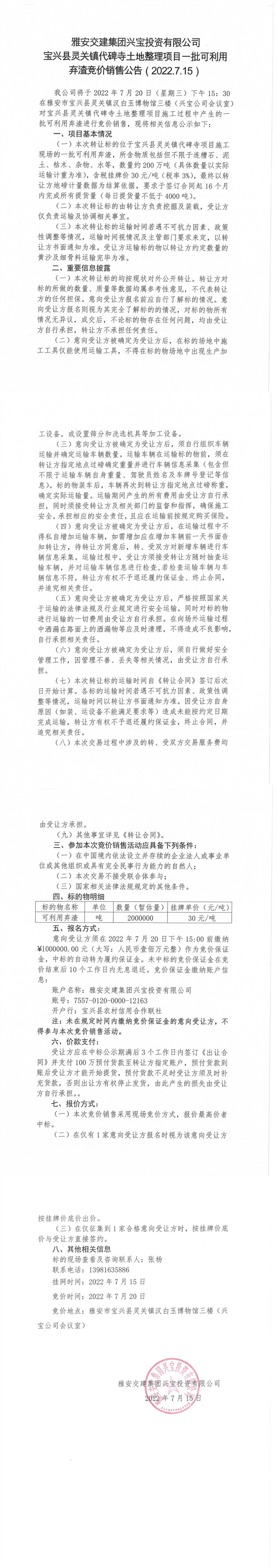 寶興縣靈關鎮(zhèn)代碑寺土地整理項目一批可利用棄渣競價銷售公告7.15(5萬噸)