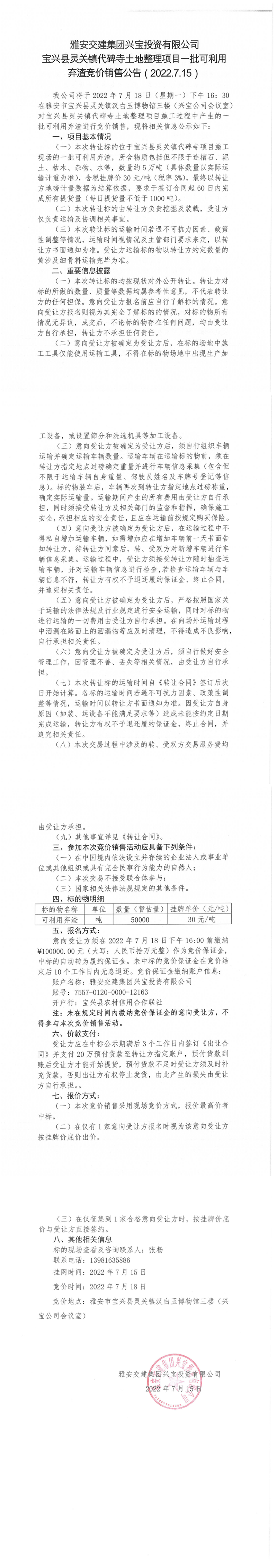 寶興縣靈關(guān)鎮(zhèn)代碑寺土地整理項(xiàng)目一批可利用棄渣競(jìng)價(jià)銷售公告7.15(5萬(wàn)噸)