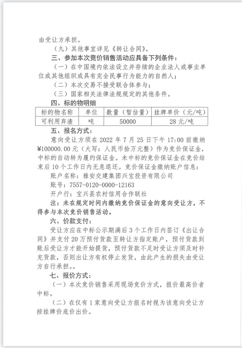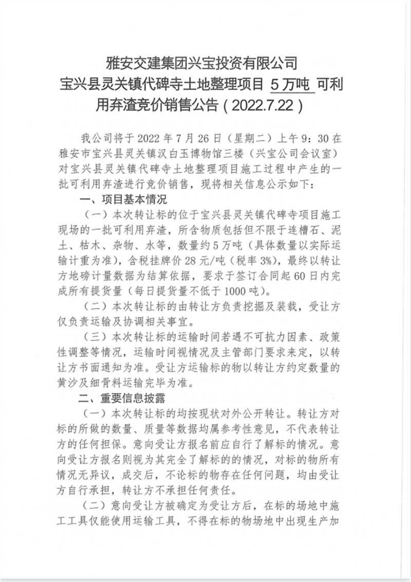 興寶公司寶興縣靈關(guān)鎮(zhèn)代碑寺土地整理項(xiàng)目10萬噸可利用棄渣競價(jià)銷售掛網(wǎng)公告7.22(10萬噸)