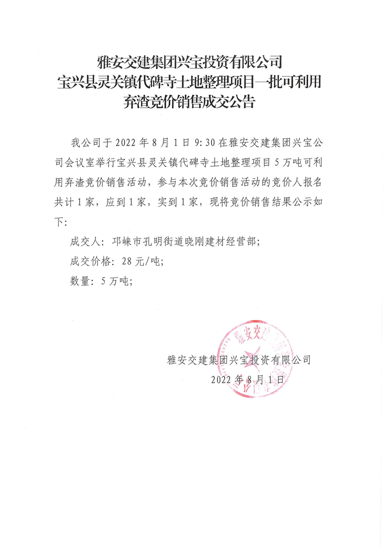 雅安交建集團興寶投資有限公司靈關(guān)鎮(zhèn)代碑寺土地整理項目10萬噸可利用棄渣競價銷售成交公告(2022.8.1)