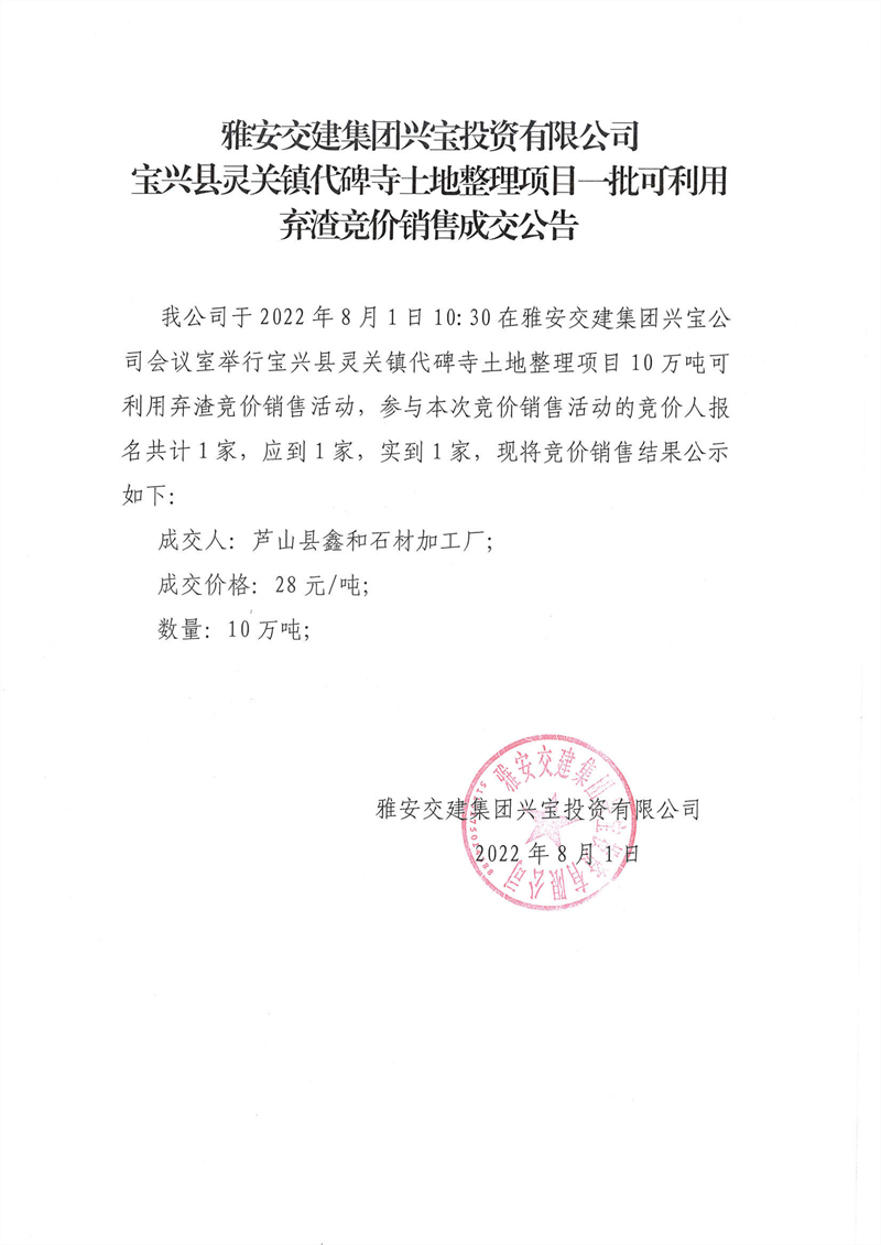 雅安交建集團(tuán)興寶投資有限公司靈關(guān)鎮(zhèn)代碑寺土地整理項(xiàng)目10萬噸可利用棄渣競價(jià)銷售成交公告(2022.8.1)