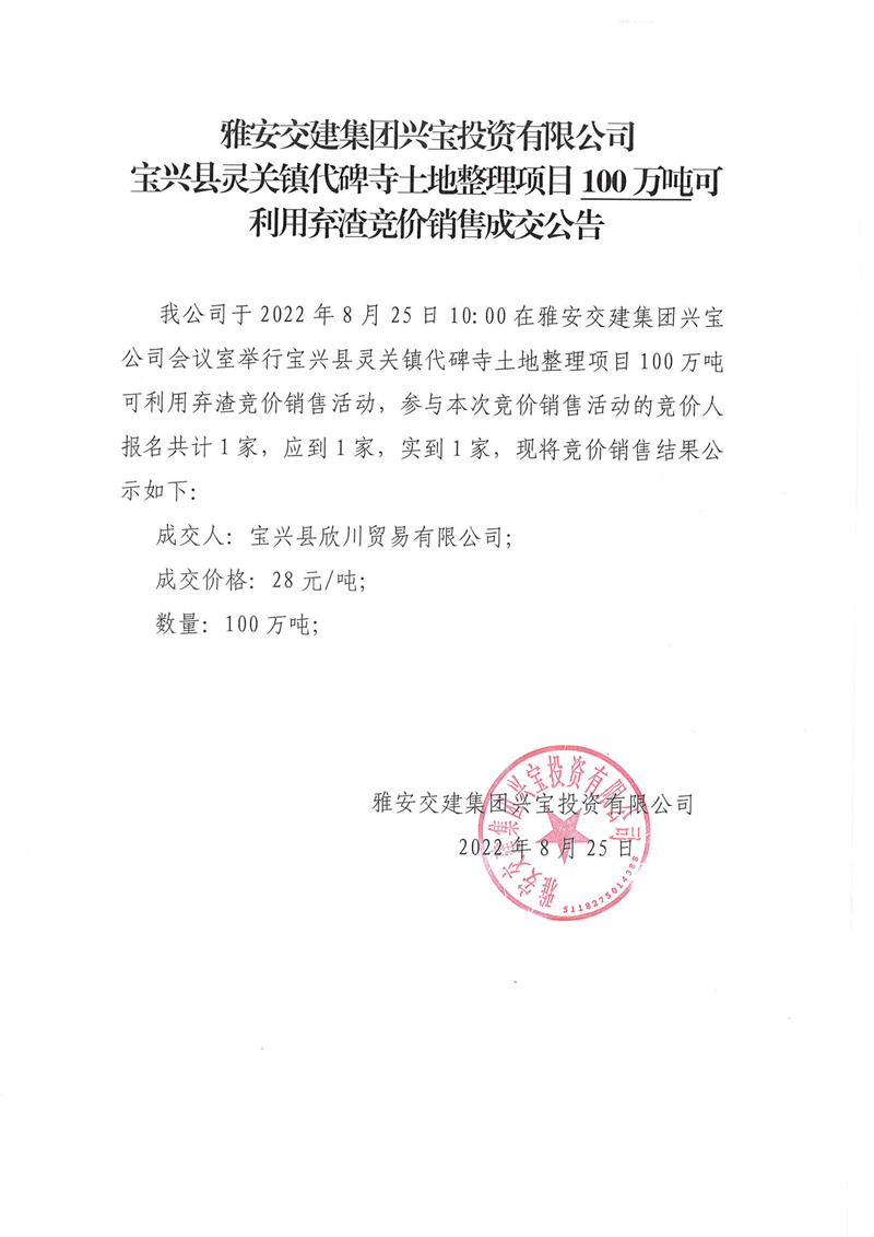 雅安交建集團(tuán)興寶投資有限公司寶興縣靈關(guān)鎮(zhèn)代碑寺土地整理項(xiàng)目5萬(wàn)噸可利用棄渣競(jìng)價(jià)銷售成交公告(8.23)