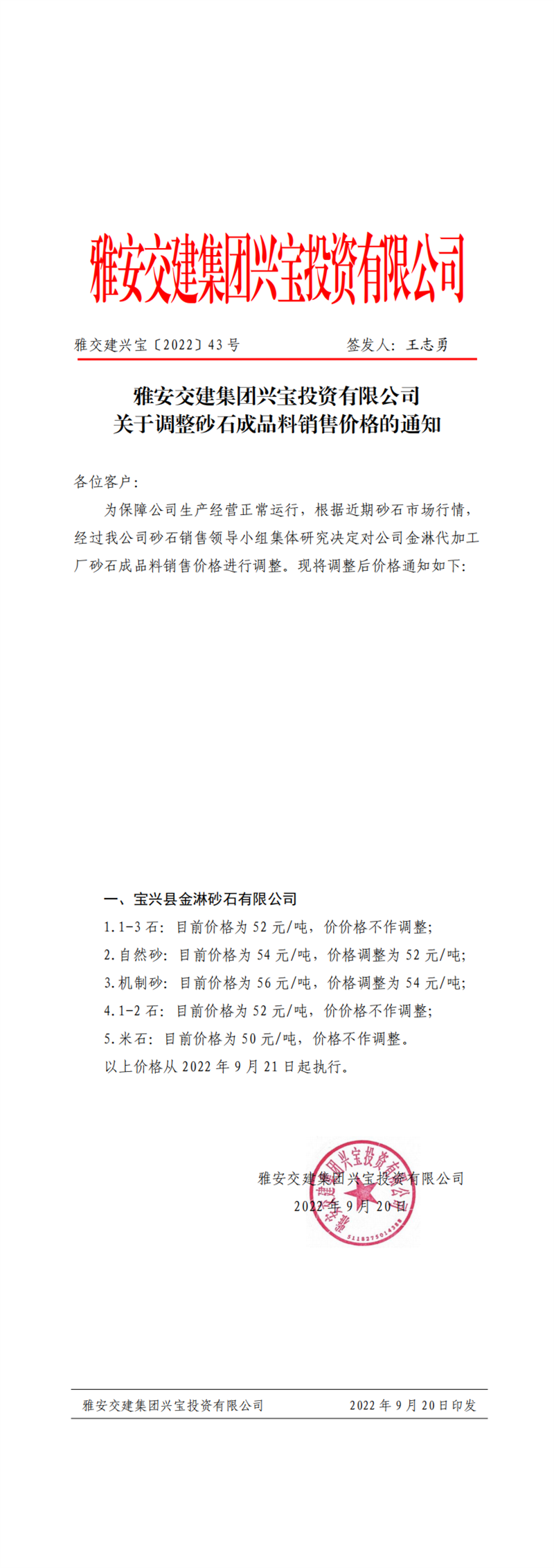 雅交建興寶〔2022〕43號(hào) 關(guān)于調(diào)整砂石成品料銷售價(jià)格的通知