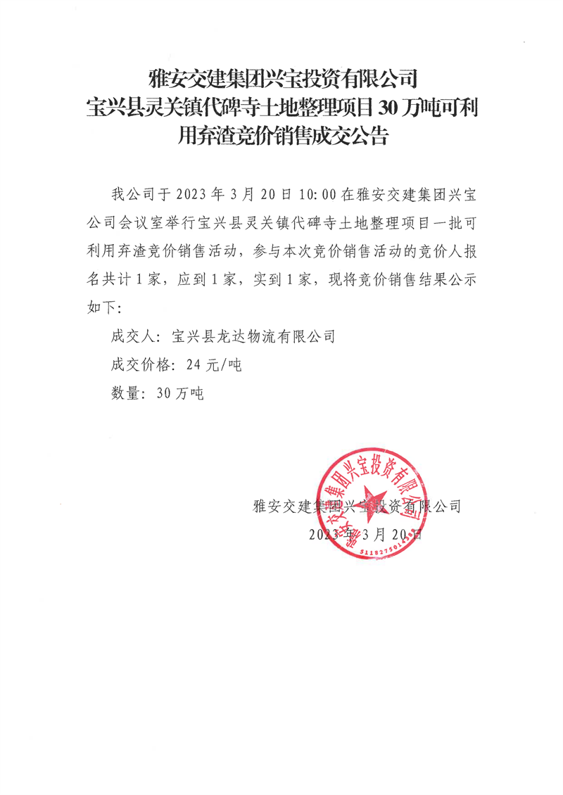 雅安交建集團興寶投資有限公司靈關(guān)鎮(zhèn)代碑寺土地整理項目30萬噸可利用棄渣競價銷售成交公告(2023.3.20)