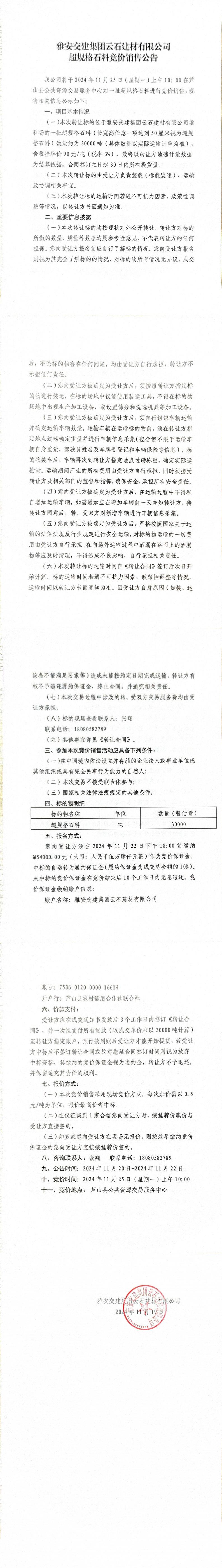 雅安交建集團(tuán)云石建材有限公司超規(guī)格石料競價銷售公告(2024-11-19)